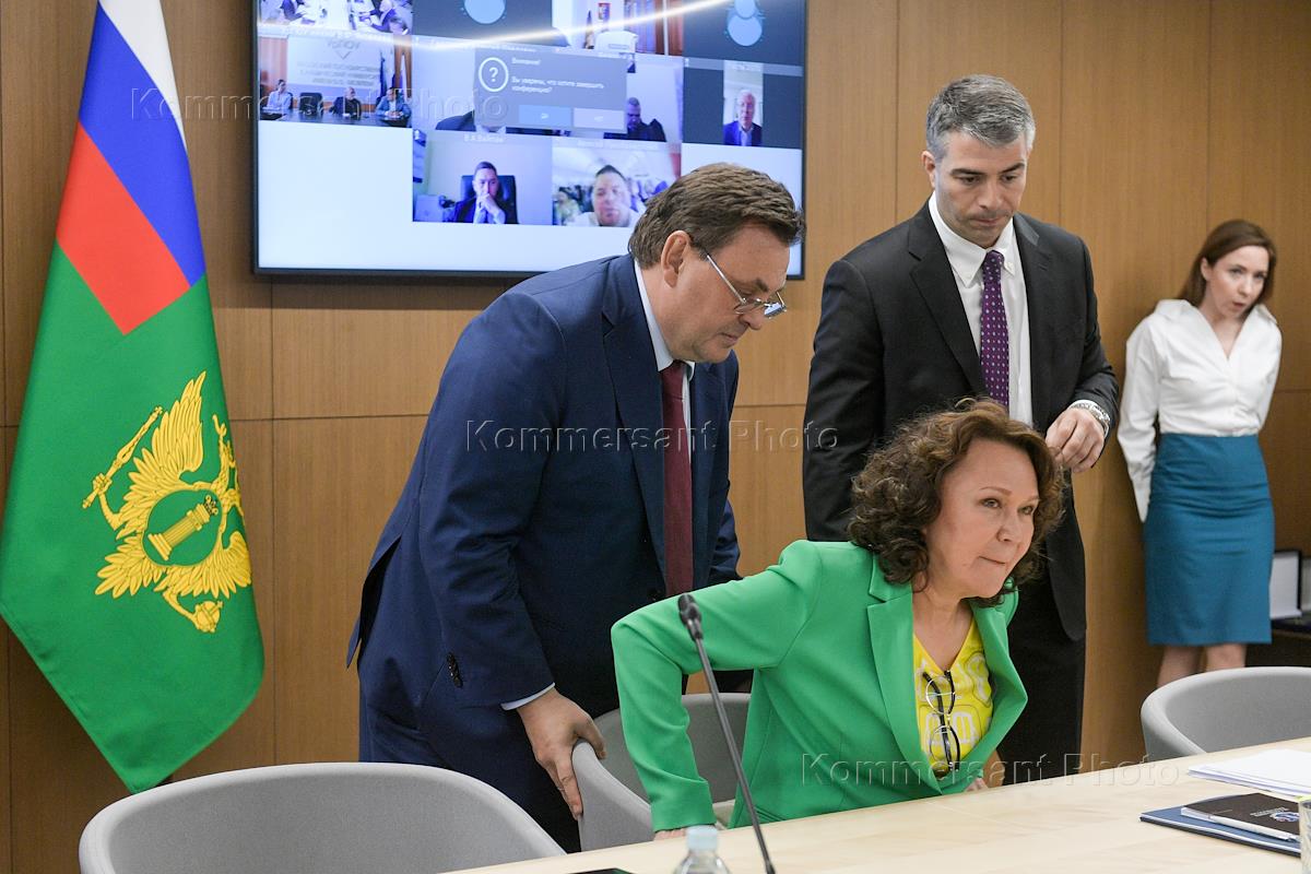 Совместное заседание Президиума и Правления Ассоциации юристов России (АЮР) в Министерстве юстиции России. Слева направо: председатель АЮР Сергей Степашин, директор института законодательства и сравнительного правоведения при правительства России Талия Хабриева и министр юстиции России Константин Чуйченко во время заседания.