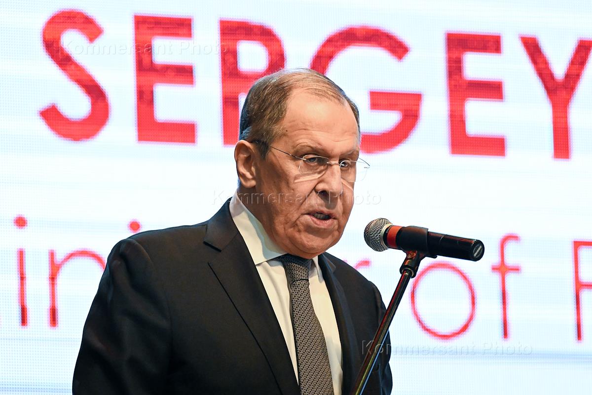 Презентация экономического, инвестиционного и туристского потенциала Вологодской области в Культурном центре ГлавУпДК при МИД России. Министр иностранных дел России Сергей Лавров во время выступления на презентации.