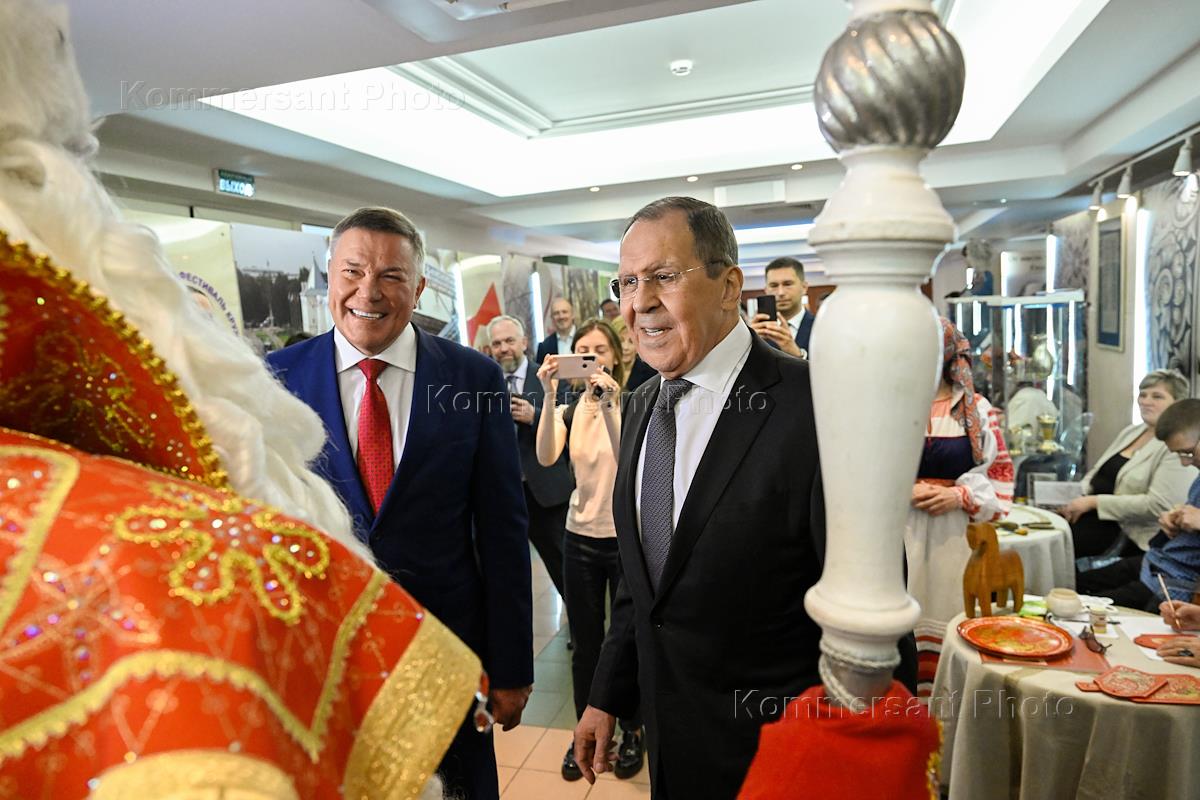 Презентация экономического, инвестиционного и туристского потенциала Вологодской области в Культурном центре ГлавУпДК при МИД России. Губернатор Вологодской области Олег Кувшинников (справа) и министр иностранных дел России Сергей Лавров (в центре) на презентации.