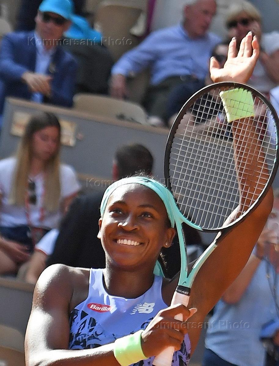 Чемпионат Франции по теннису "Ролан Гаррос" 2022 (Roland Garros 2022). Полуфиналы в женских одиночных разрядах. Американская теннисистка Кори Гауфф во время матча с итальянской теннисисткой Мартиной Тревисан.