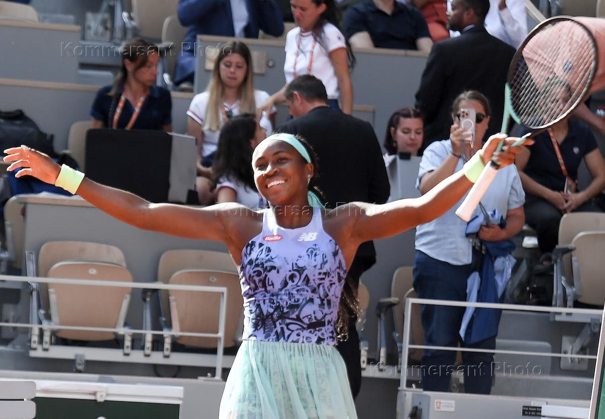 Чемпионат Франции по теннису "Ролан Гаррос" 2022 (Roland Garros 2022). Полуфиналы в женских одиночных разрядах. Американская теннисистка Кори Гауфф во время матча с итальянской теннисисткой Мартиной Тревисан.