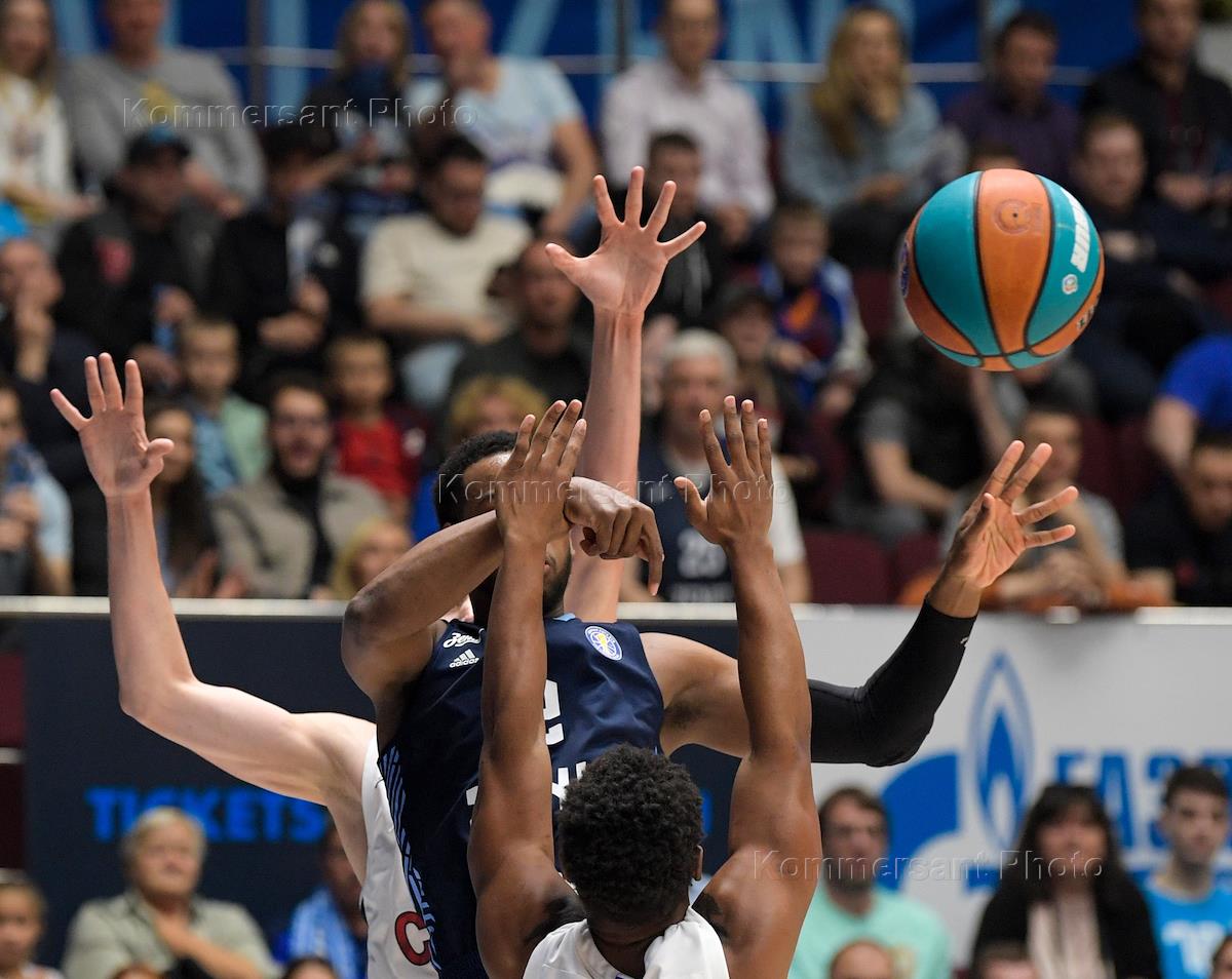Единая лига ВТБ по баскетболу. Финал. Матч между командами ЦСКА (Москва) - "Зенит" (Санкт-Петербург) на стадионе "СИБУР Арена" в Санкт-Петербурге. Игрок команды ЦСКА Йонас Йеребко (второй слева) и игрок команды "Зенит" Денис Захаров (в центре) во время матча.