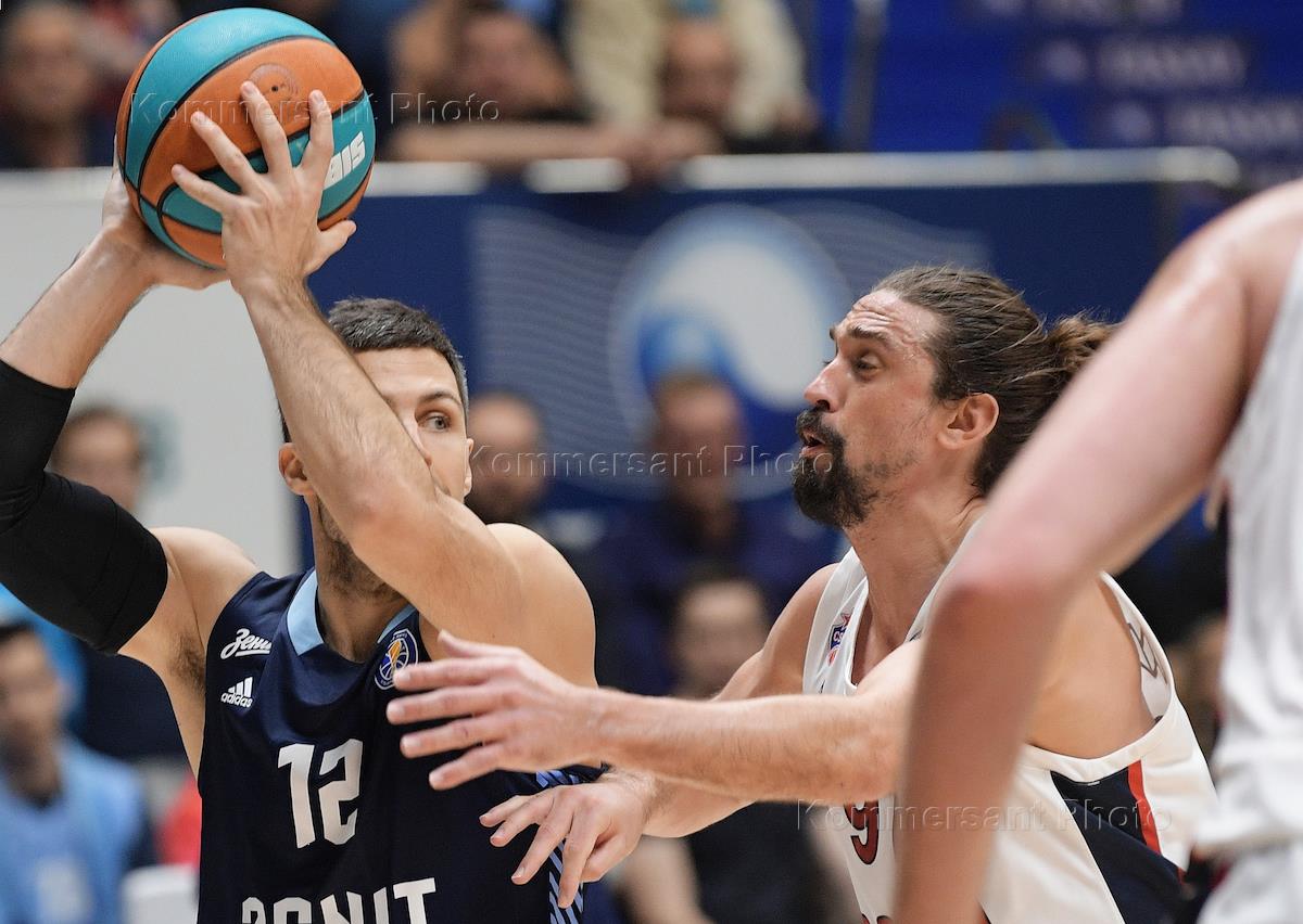 VTB United Basketball League. The final. Match between the teams of CSKA (Moscow) - "Zenit" (St. Petersburg) at the stadium "SIBUR Arena" in St. Petersburg. CSKA team player Alexei Shved (left) and Zenit team player Andrei Zubkov (center) during the match.