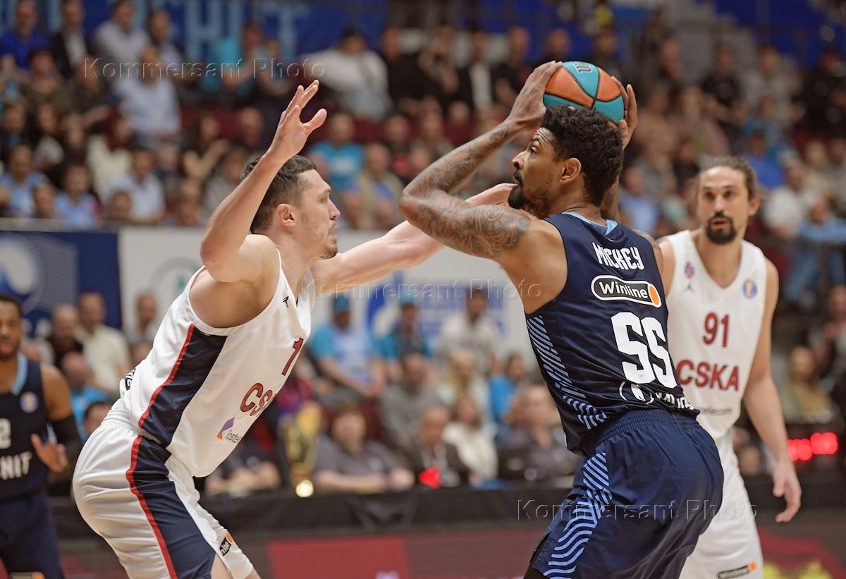 Единая лига ВТБ по баскетболу. Финал. Матч между командами ЦСКА (Москва) - "Зенит" (Санкт-Петербург) на стадионе "СИБУР Арена" в Санкт-Петербурге. Игрок команды ЦСКА Алексей Швед (в центре) во время матча.