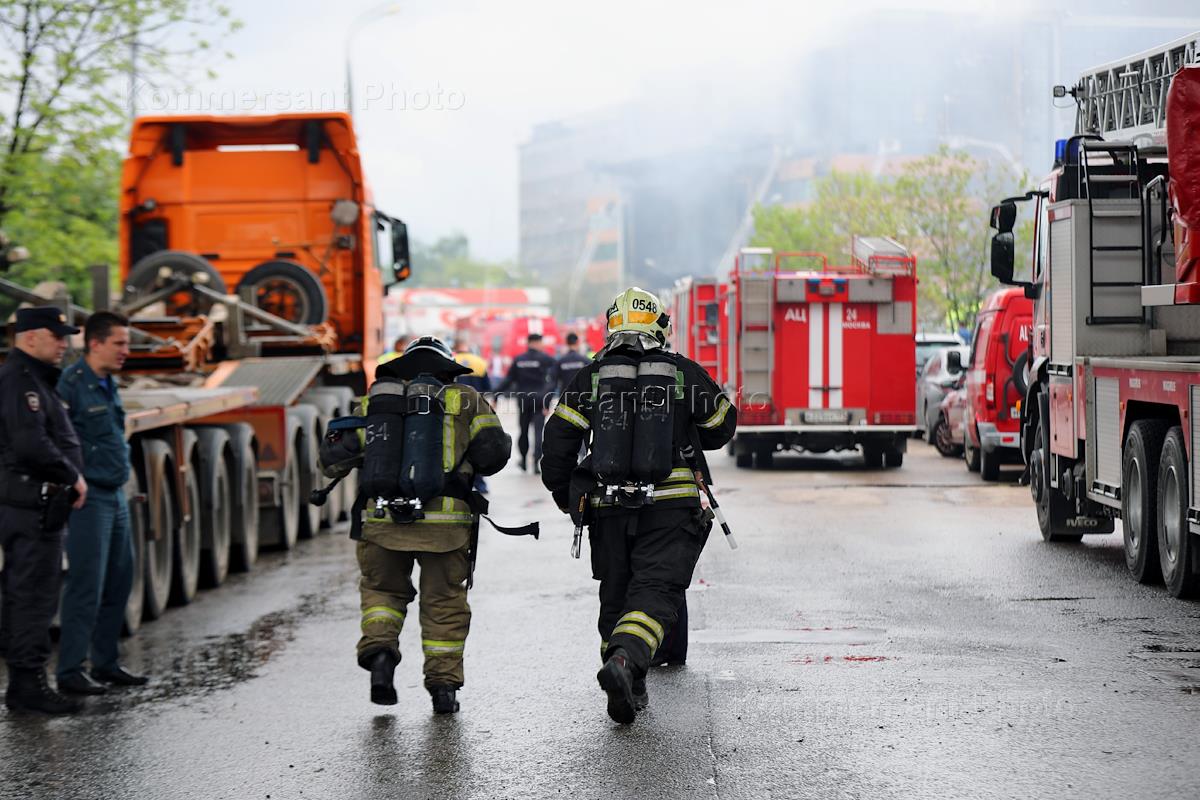 Пожар в бизнес-центре "Гранд Сетунь Плаза" на улице Горбунова. Сотрудники пожарной службы МЧС России во время тушения пожара.
