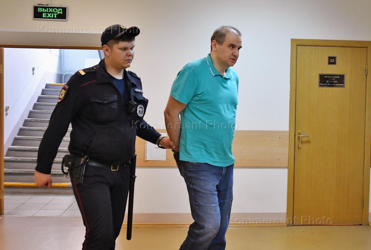 Consideration of a criminal case against the former Deputy Chairman of the Council of Ministers of the Donetsk People's Republic (DPR) Alexander Timofeev, accused of fraud, in the Khoroshevsky District Court. Former Deputy Chairman of the Council of Ministers of the DPR Alexander Timofeev (center) before the meeting.