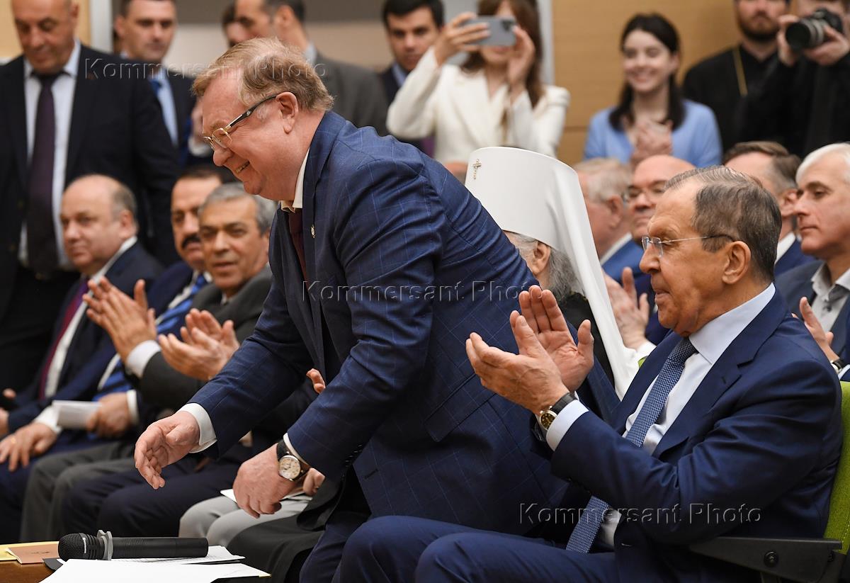 Ceremonial meeting dedicated to the 140th anniversary of the Imperial Orthodox Palestinian Society in the House of the Russian Diaspora named after Solzhenitsyn. Chairman of the Imperial Orthodox Palestinian Society Sergei Stepashin (center) and Russian Foreign Minister Sergei Lavrov (right) during a meeting.