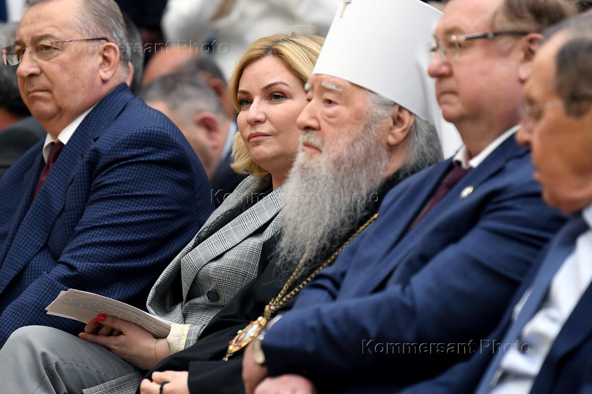 Ceremonial meeting dedicated to the 140th anniversary of the Imperial Orthodox Palestinian Society in the House of the Russian Diaspora named after Solzhenitsyn. From left to right: Chairman of the Board, President of Transneft Nikolai Tokarev, Russian Minister of Culture Olga Lyubimova, Metropolitan Yuvenaly Krutitsy and Kolomesky, Chairman of the Imperial Orthodox Palestinian Society Sergei Stepashin and Russian Foreign Minister Sergei Lavrov during a meeting.