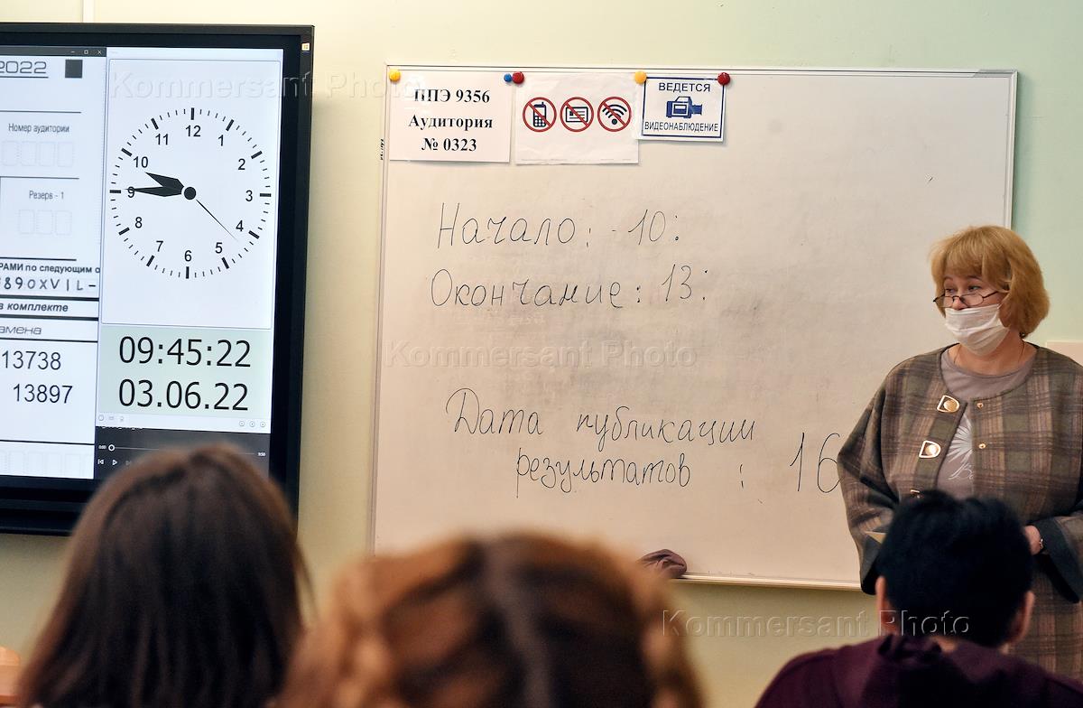 Conducting the Unified State Examination (USE) in mathematics (basic level) at the State Budgetary Educational Institution of the city of Moscow "School No. 1547". Genre photography. Examination Point Headquarters area.