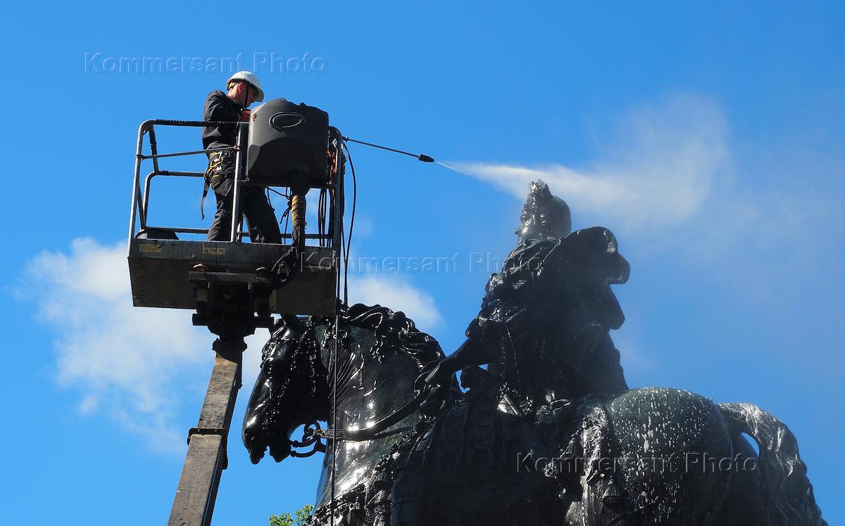 Виды Санкт-Петербурга. Жанровая фотография. Реставраторы музея городской скульптуры во время промывки памятника Петру Первому на Кленовой улице.