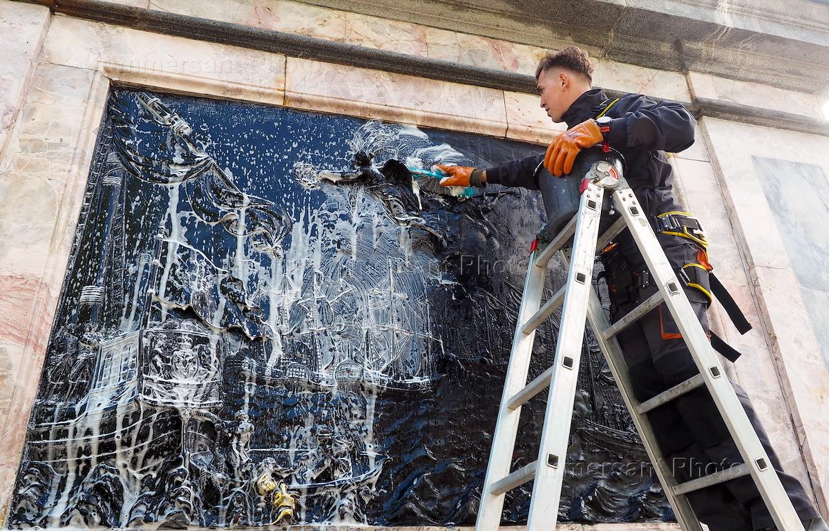 Views of St. Petersburg. Genre photography. Restorers of the Museum of Urban Sculpture cleaning the monument to Peter the Great on Klenovaya Street.