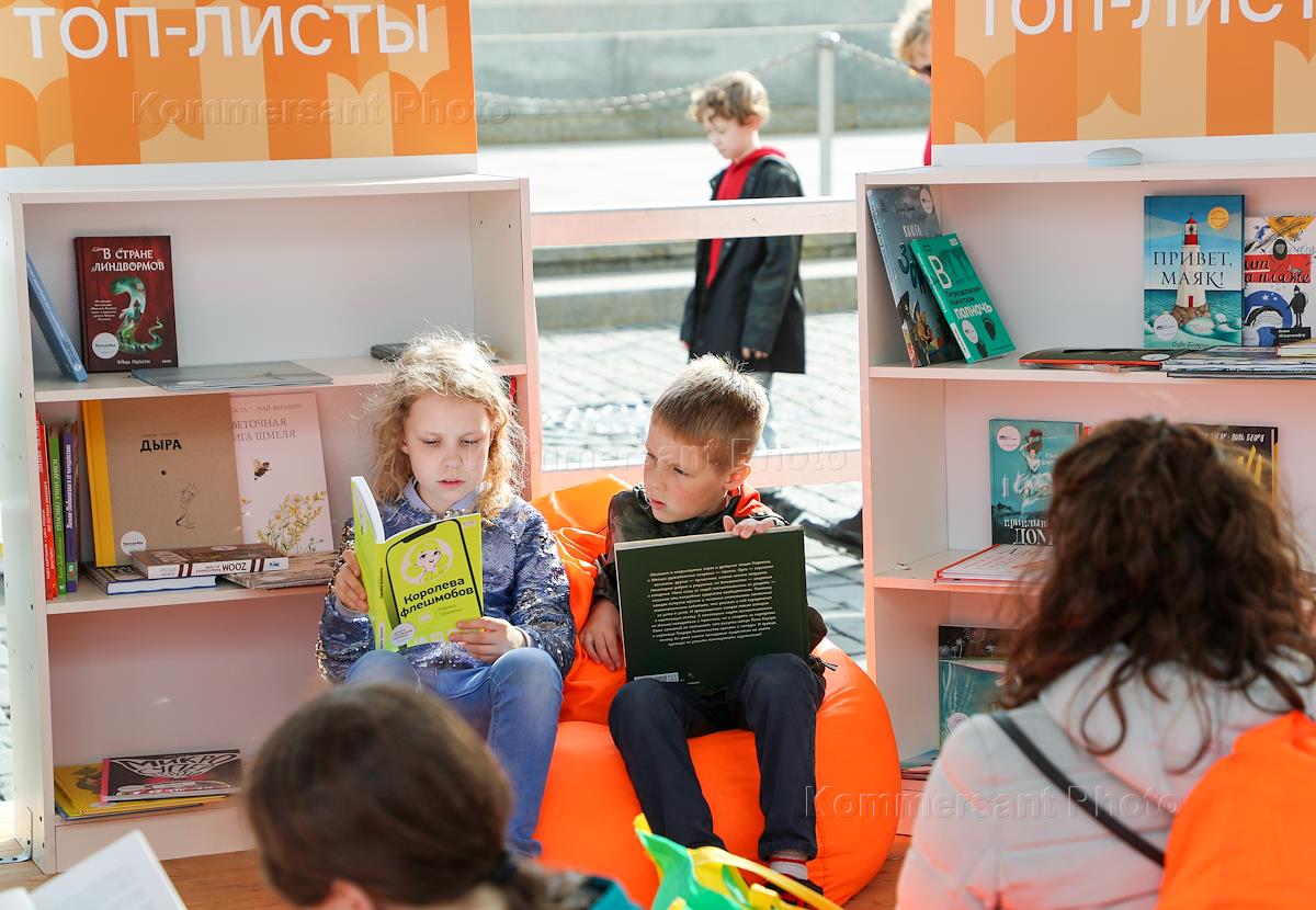 VIII annual book festival "Red Square". Genre photography. Children read books.