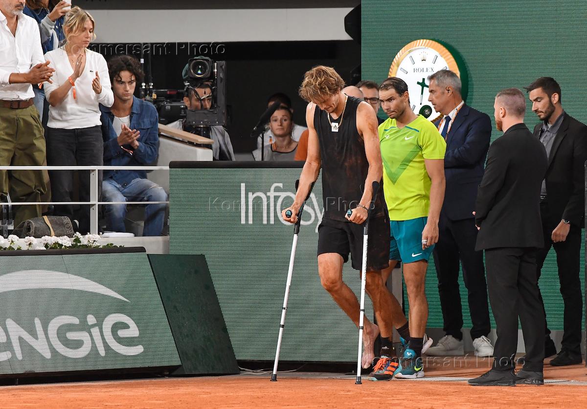 Чемпионат Франции по теннису "Ролан Гаррос" 2022 (Roland Garros 2022). Полуфиналы в мужских одиночных разрядах. Немецкий теннисист Александр Зверев (на коляске) во время матча.
