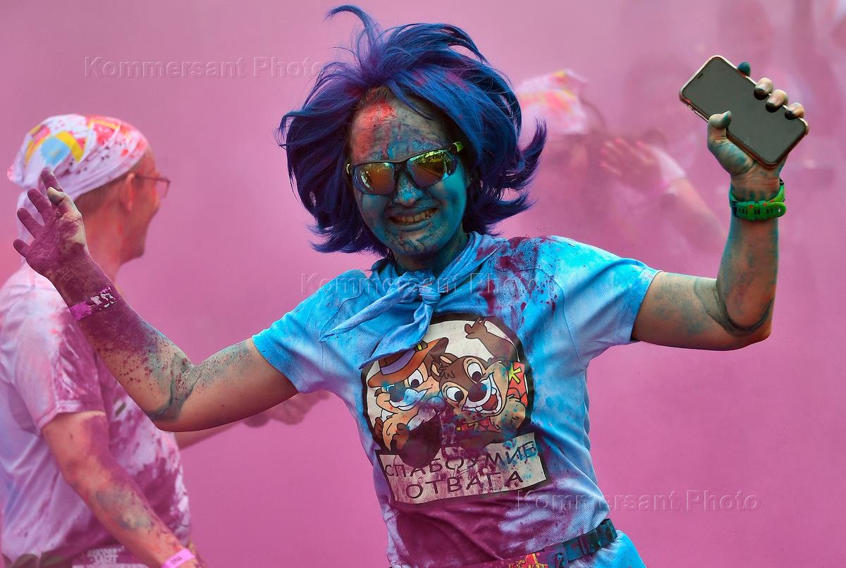 "Красочный забег" вокруг территории Олимпийского комплекса "Лужники". Участник во время забега.