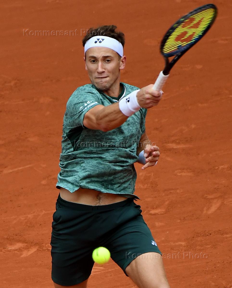 Теннисный турнир "Ролан Гаррос 2022" (Roland-Garros). Финал в мужском одиночном разряде. Норвежский теннисист Каспер Рууд во время матча с испанским теннисистом Рафаэлем Надалем.