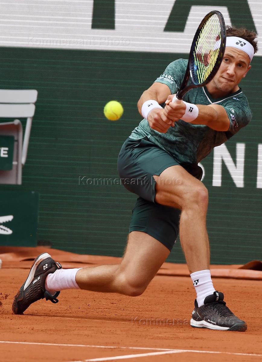 Tennis tournament "Roland Garros 2022". Finals in men's singles. Norwegian tennis player Casper Ruud during a match with Spanish tennis player Rafael Nadal.