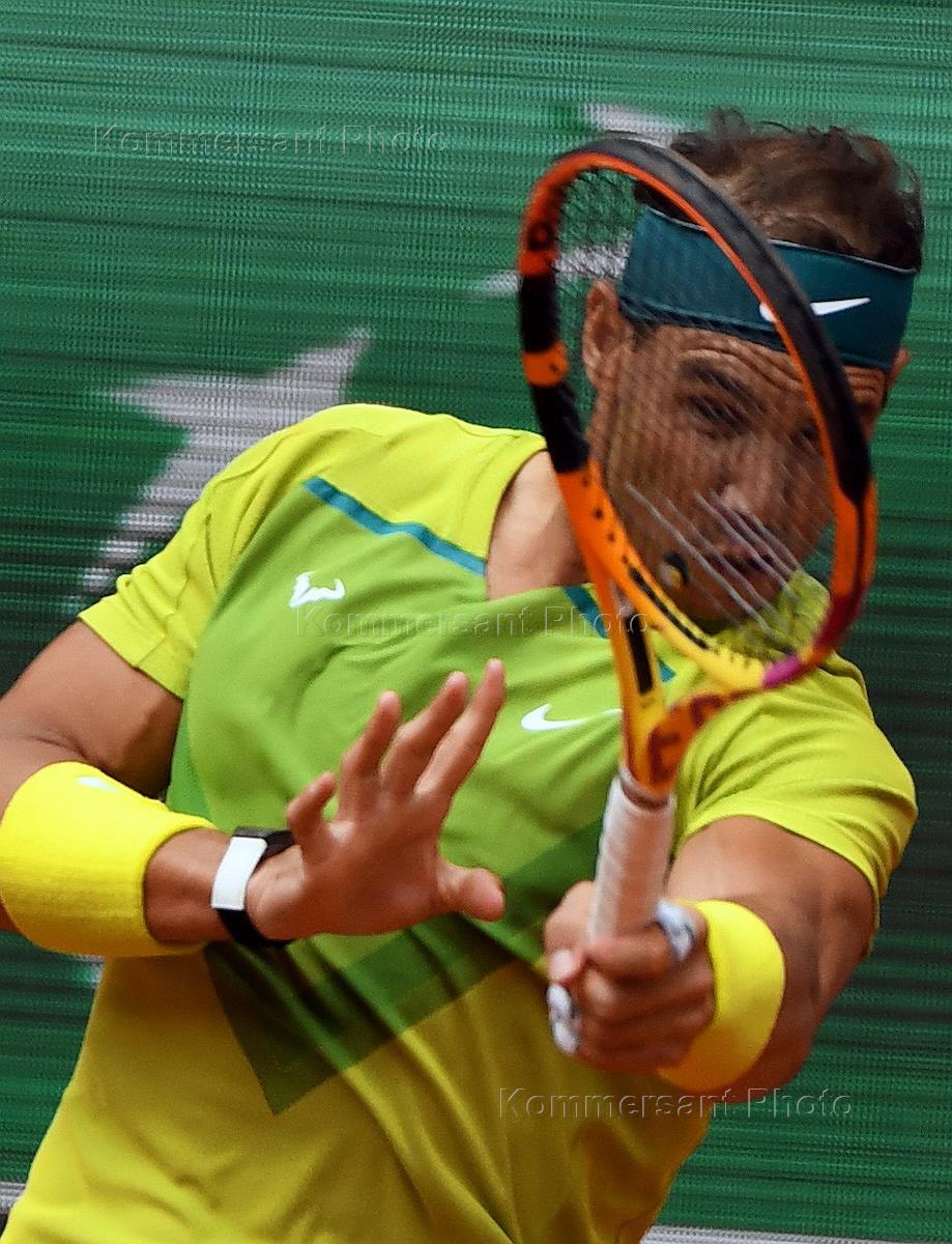 Tennis tournament "Roland Garros 2022". Finals in men's singles. Spanish tennis player Rafael Nadal during a match with Norwegian tennis player Casper Ruud.