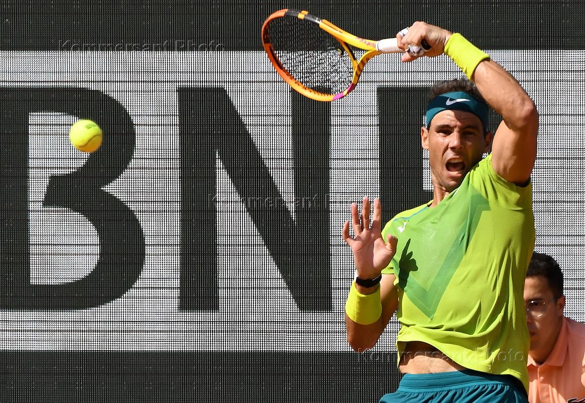 Теннисный турнир "Ролан Гаррос 2022" (Roland-Garros). Финал в мужском одиночном разряде. Испанский теннисист Рафаэль Надаль во время матча с норвежским теннисистом Каспером Руудом.