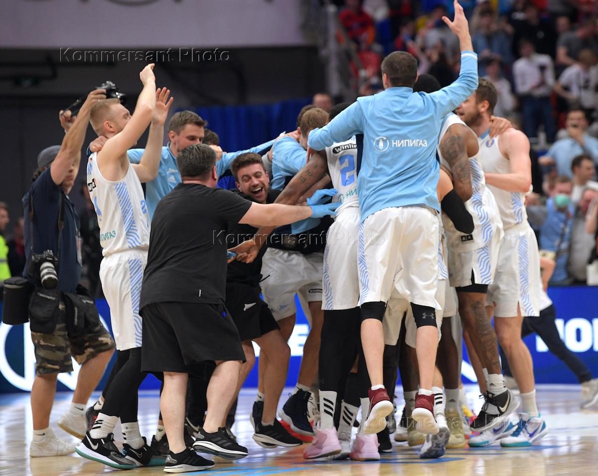 Единая лига ВТБ по баскетболу. Финал. Матч между командами ЦСКА (Москва) - "Зенит" (Санкт-Петербург) на стадионе "Мегаспорт". Игроки команды "Зенит" после матча.