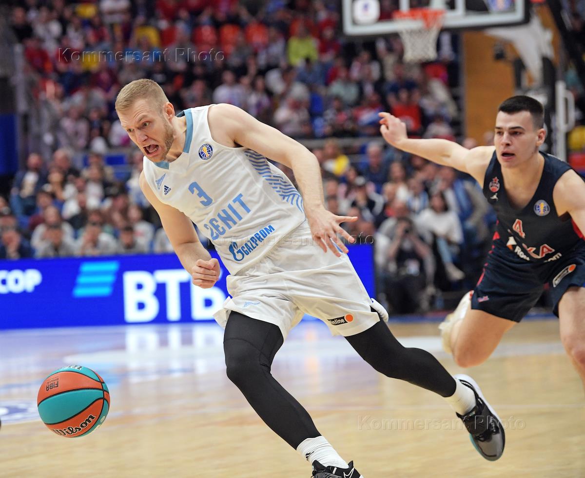 Единая лига ВТБ по баскетболу. Финал. Матч между командами ЦСКА (Москва) - "Зенит" (Санкт-Петербург) на стадионе "Мегаспорт". Игрок команды "Зенит" Денис Захаров (слева) во время матча.