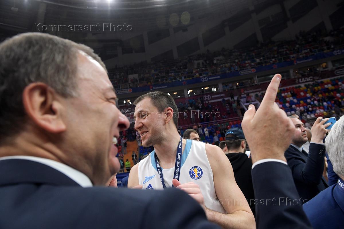 Единая лига ВТБ по баскетболу. Финал. Матч между командами ЦСКА (Москва) - "Зенит" (Санкт-Петербург) на стадионе "Мегаспорт". Президент Единой лиги ВТБ по баскетболу Сергей Кущенко (слева) во время церемонии награждения победителей.
