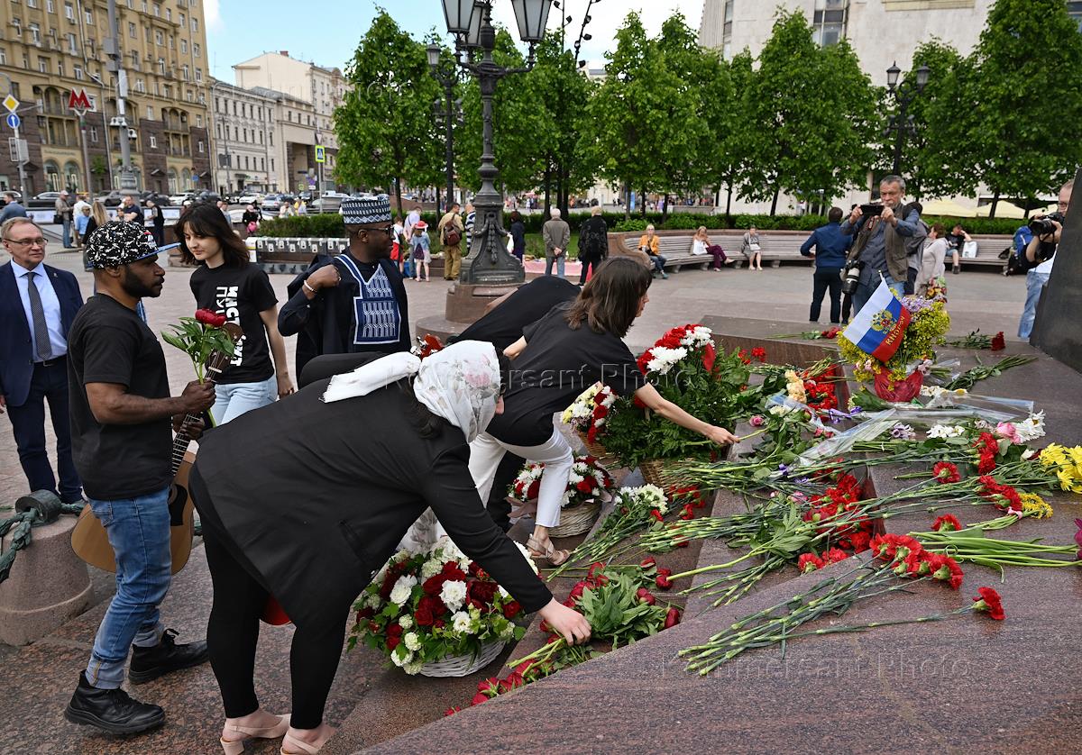 Solemn laying of flowers at the monument to the poet Alexander Pushkin on Pushkin Square.