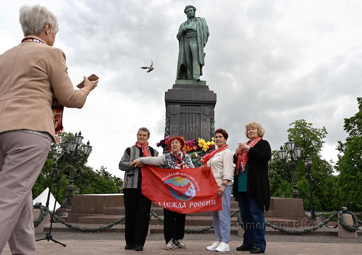 Церемония торжественного возложения цветов к памятнику поэту Александру Пушкину на Пушкинской площади в День рождения поэта, организованная КПРФ. Студенты Института Пушкина во время церемонии.
