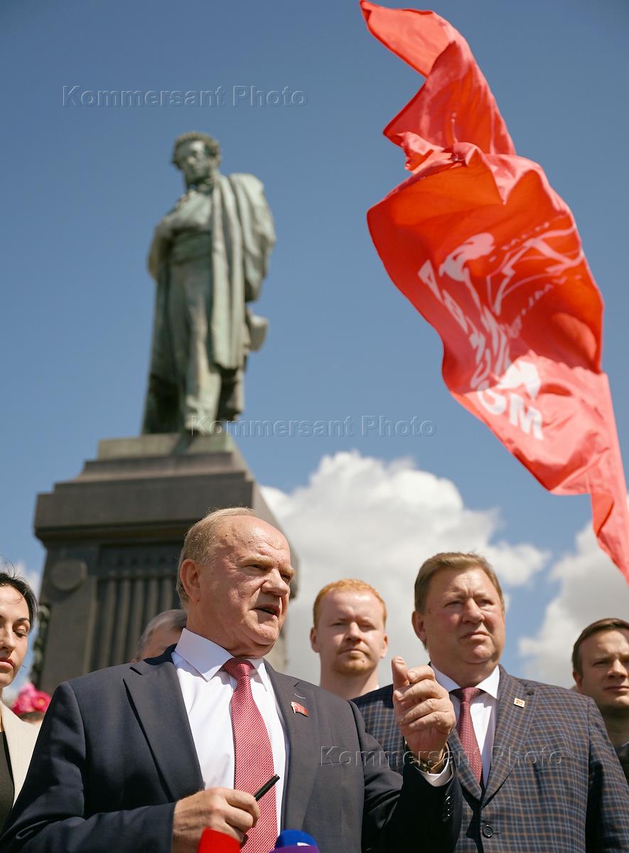Церемония торжественного возложения цветов к памятнику поэту Александру Пушкину на Пушкинской площади, организованная КПРФ. Лидер КПРФ Геннадий Зюганов (в центре) во время церемонии.