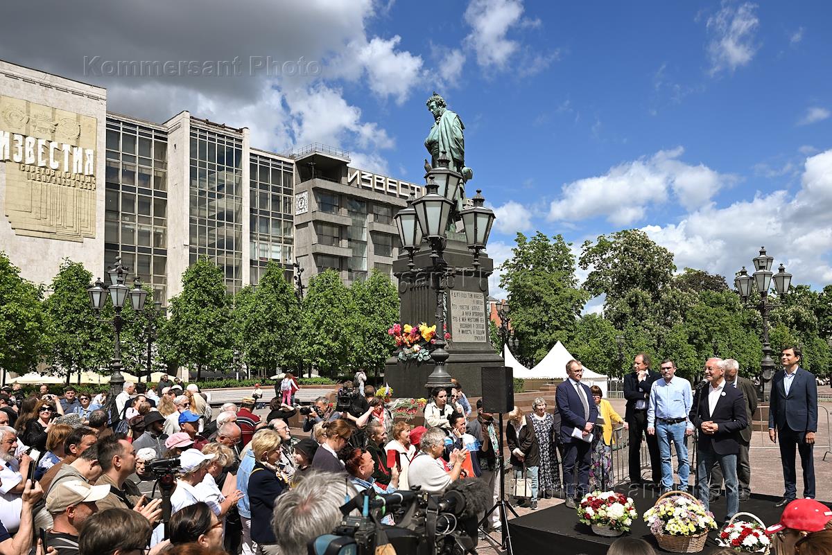 The solemn flower-laying ceremony at the monument to the poet Alexander Pushkin on Pushkinskaya Square on the birthday of the poet, organized by the Communist Party of the Russian Federation. Deputy of the Moscow City Duma Yevgeny Gerasimov (second from right) speaking at the ceremony.