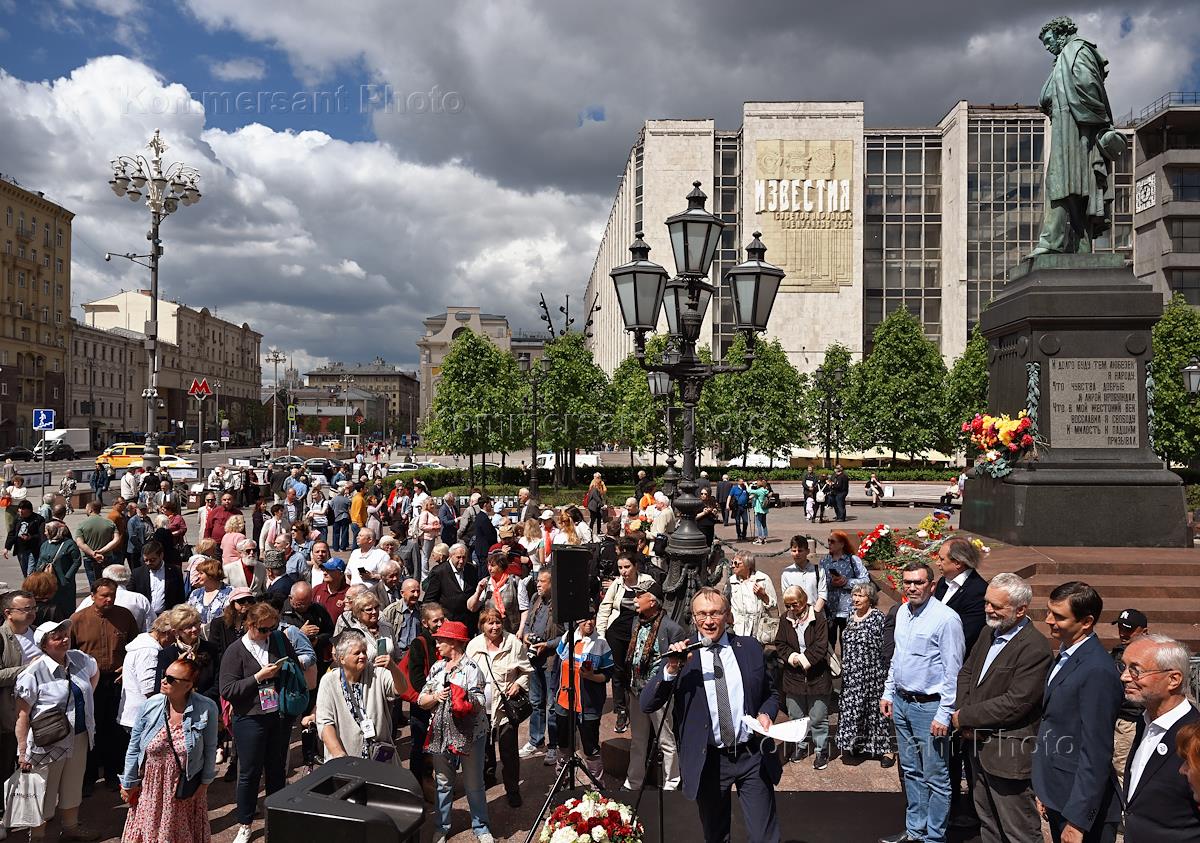 The solemn flower-laying ceremony at the monument to the poet Alexander Pushkin on Pushkinskaya Square on the birthday of the poet, organized by the Communist Party of the Russian Federation. Deputy of the Moscow City Duma Yevgeny Gerasimov (second from right) speaking at the ceremony.