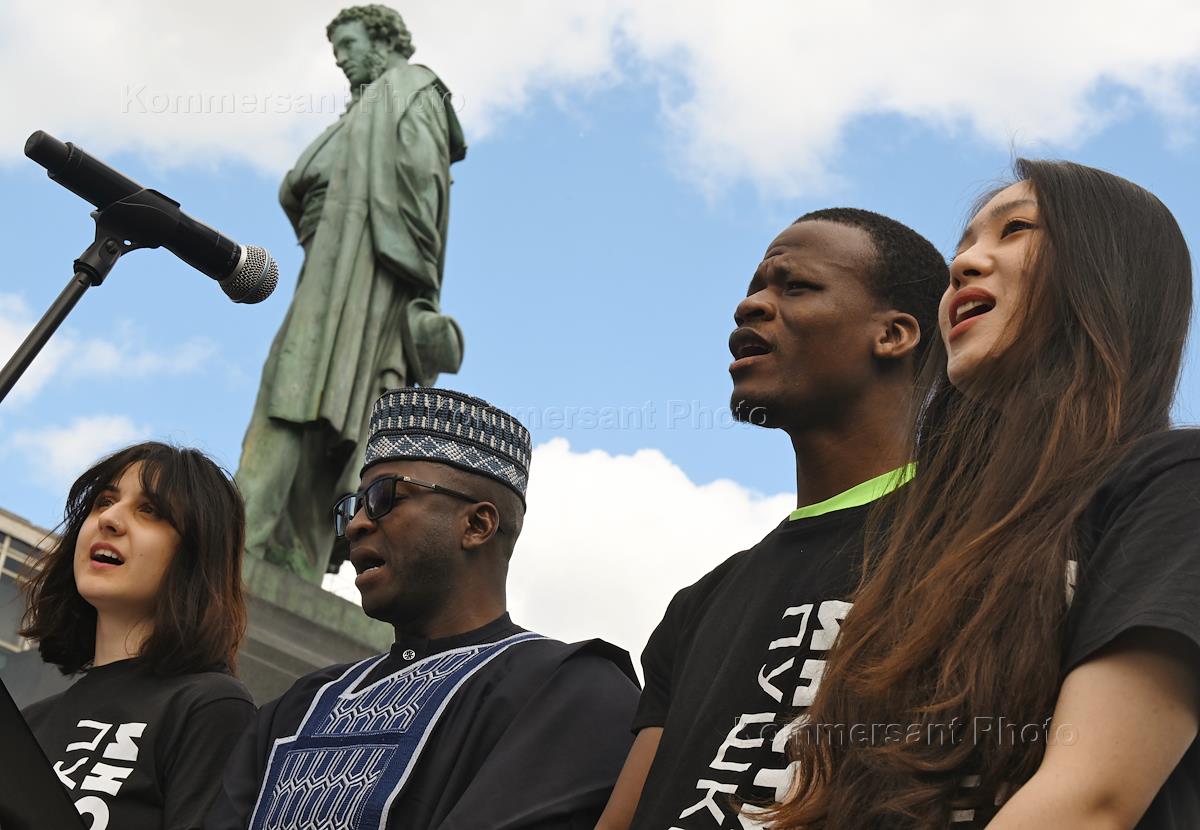 The solemn flower-laying ceremony at the monument to the poet Alexander Pushkin on Pushkinskaya Square on the birthday of the poet, organized by the Communist Party of the Russian Federation. Students of the Pushkin Institute during the ceremony.
