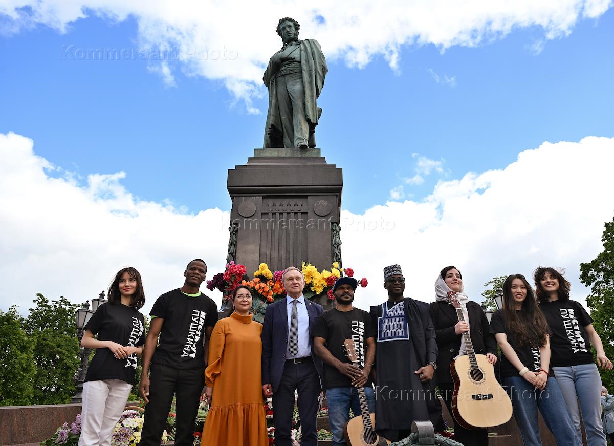 The solemn flower-laying ceremony at the monument to the poet Alexander Pushkin on Pushkinskaya Square on the birthday of the poet, organized by the Communist Party of the Russian Federation. Students of the Pushkin Institute during the ceremony.