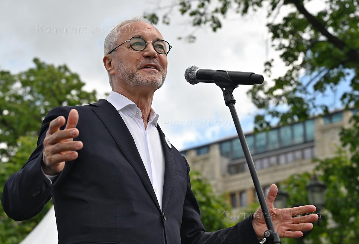 Церемония торжественного возложения цветов к памятнику поэту Александру Пушкину на Пушкинской площади в День рождения поэта, организованная КПРФ. Директор Департамента государственной поддержки периодической печати и книжной индустрии Министерство цифрового развития, связи и массовых коммуникаций России Владимир Григорьев во время выступления на церемонии.
