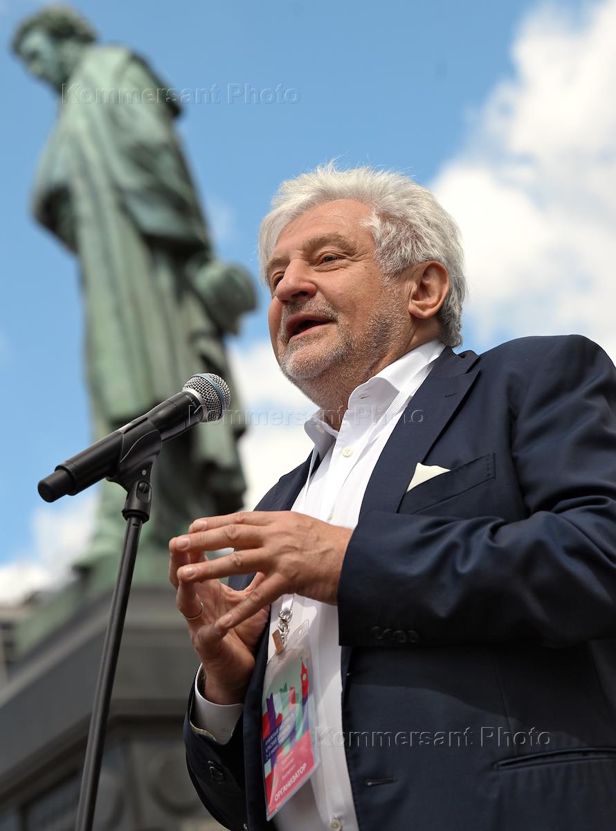Торжественное церемония возложения цветов к памятнику поэту Александру Пушкину на Пушкинской площади. Директор Государственного музея А.С.Пушкина Евгений Богатырев во время церемонии.