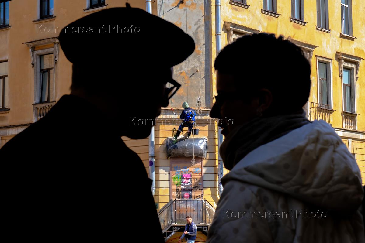 Views of St. Petersburg. Genre photography. A public utility employee paints over a portrait of the poet Daniil Kharms on the facade of a house on the corner of Kovnosky Lane and Mayakovsky Street.