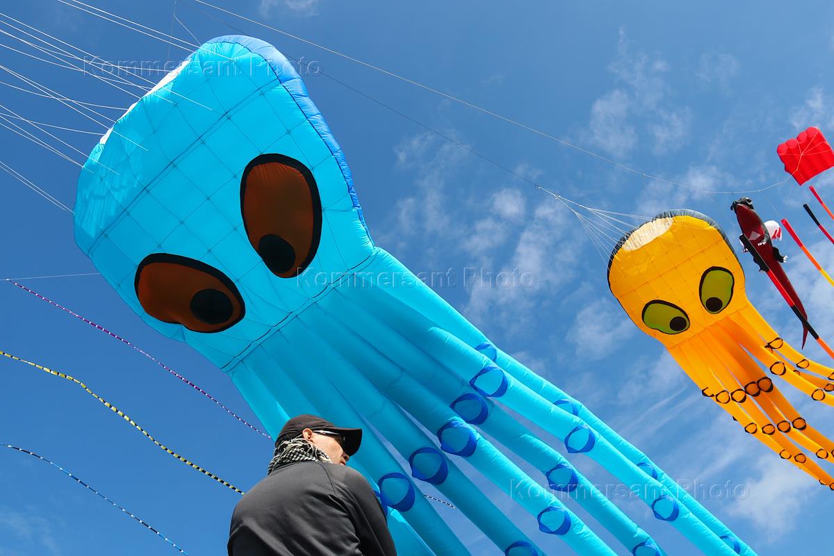 IV Международный фестиваль воздушных змеев "Фортолет" в историко-культурном комплексе "Форт Константин". Жанровая фотография. Мужчина наблюдает за полетом воздушных змеев в виде осьминогов.