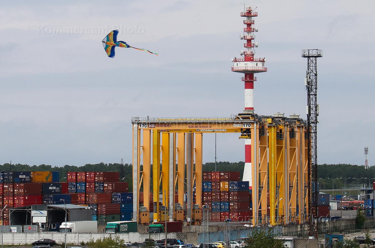 IV Международный фестиваль воздушных змеев "Фортолет" в историко-культурном комплексе "Форт Константин". Жанровая фотография. Воздушный змей на фоне склада контейнеров.
