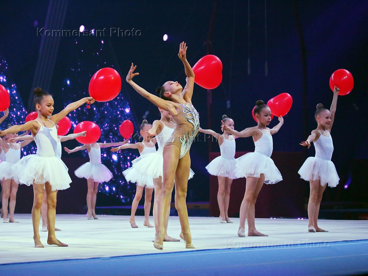 The show of the Olympic champion in gymnastics, the first deputy head of CSKA Svetlana Khorkina "Ascension" in the Yubileiny sports complex. Performance by athletes in rhythmic gymnastics.