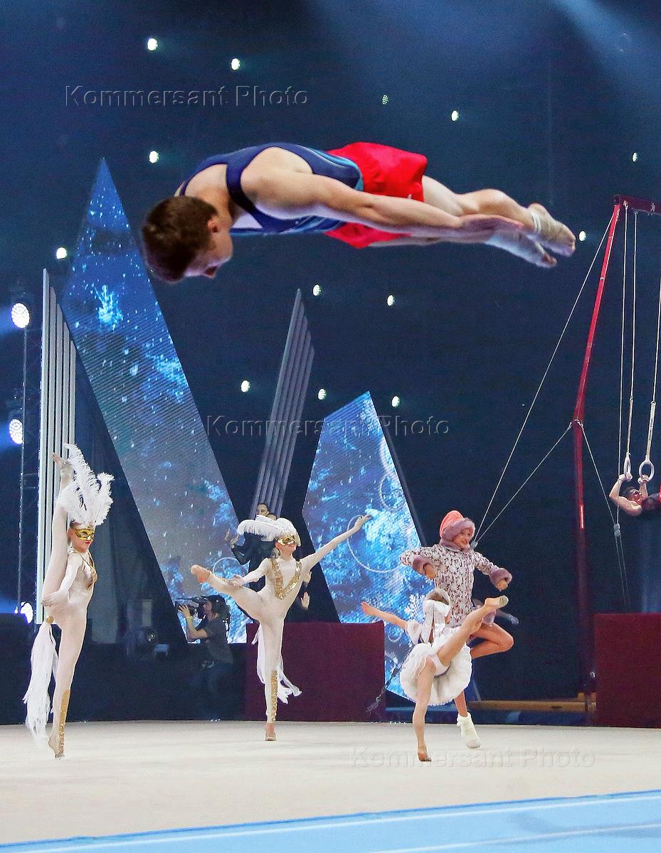 The show of the Olympic champion in gymnastics, the first deputy head of CSKA Svetlana Khorkina "Ascension" in the Yubileiny sports complex. Show participant gymnast Sergei Yelshov during a performance.