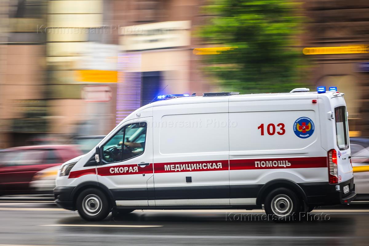 Genre photography. Ambulance car on the city street.