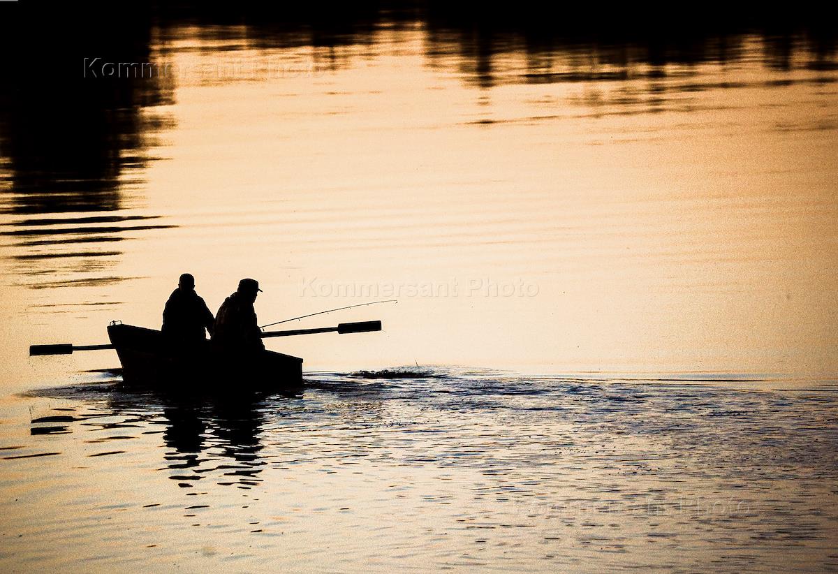 Genre photography. Fishermen on a boat are sailing along the Oka river.