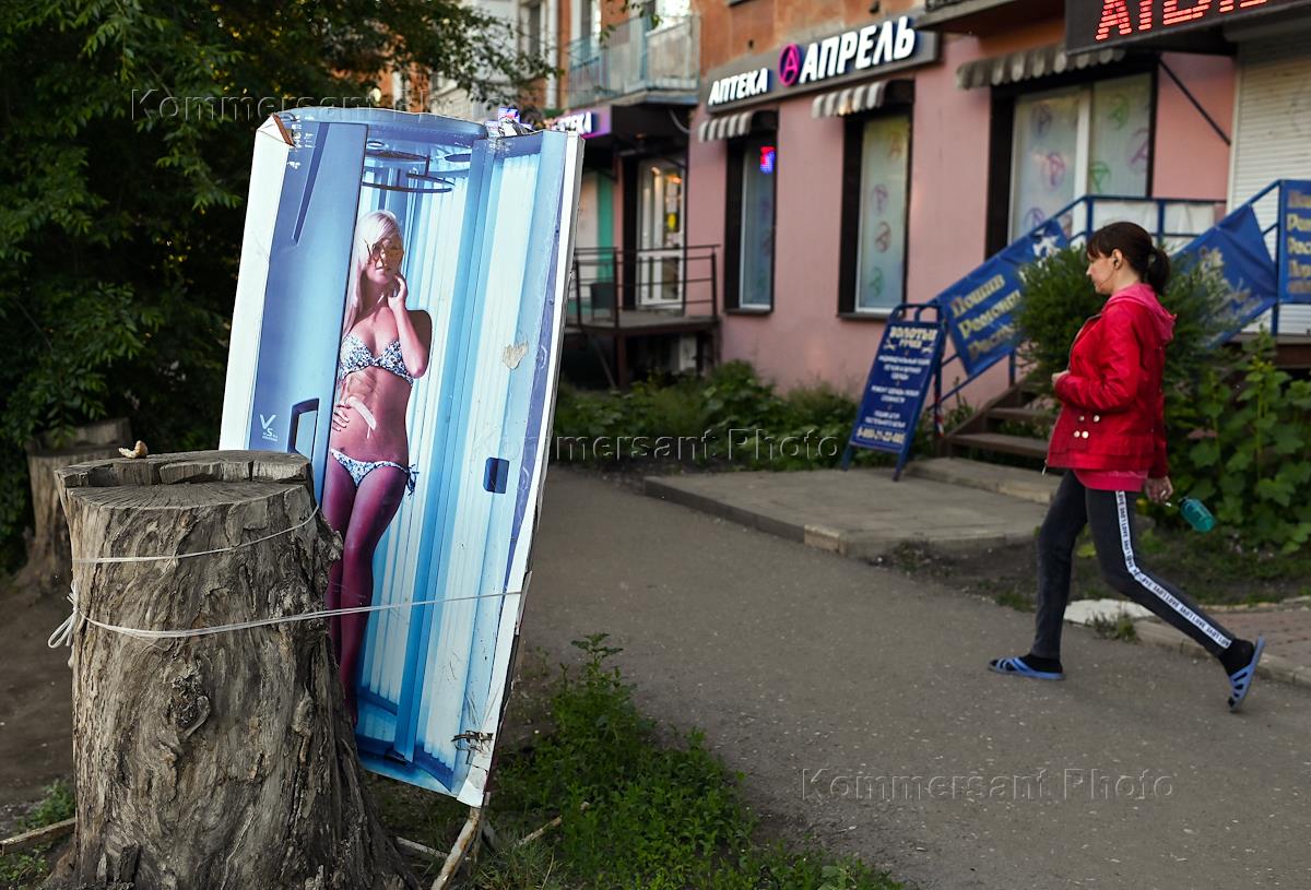Views of Omsk. Genre photography. An advertising poster for a solarium tied to a tree stump.