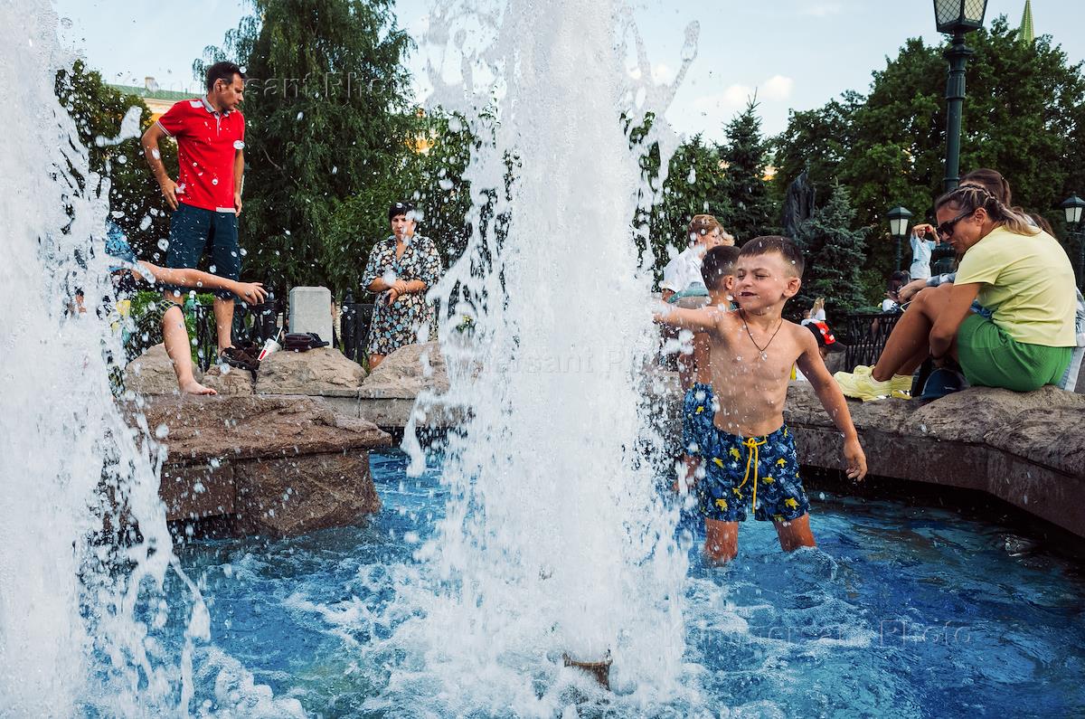 Views of Moscow. Genre photography. Vacationers at the fountain in the Alexander Garden.