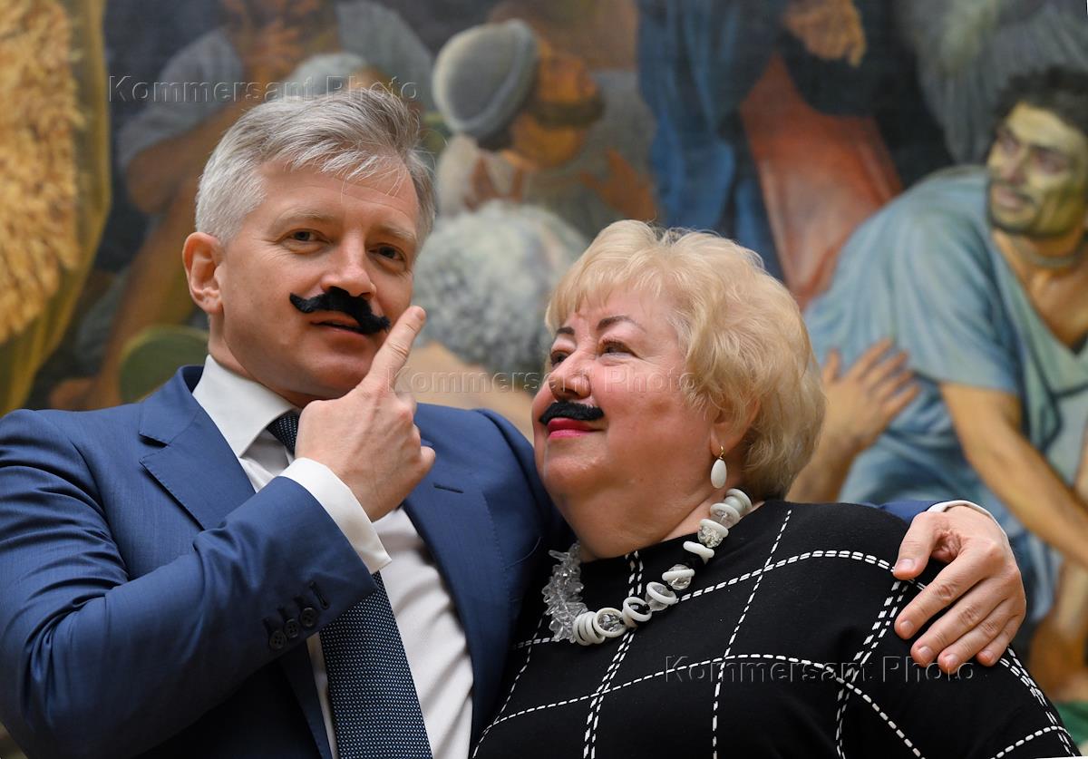 Пресс-показ выставки "Петр Великий. Усы властелина", приуроченная к 350-летию со дня рождения Петра I, в Государственной Третьяковской галерее. Руководитель департамента культуры города Москвы Александр Кибовский (слева) и куратор выставки, заведующая отделом живописи XVIII – первой половины XIX века Государственной Третьяковской галереи Людмила Маркина (справа) на выставке.