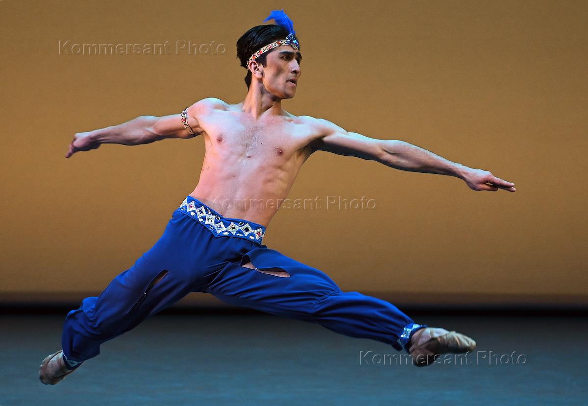 XIV International competition of ballet dancers and choreographers on the new stage of the State Academic Bolshoi Theater (SABT). Second round, senior group. Ballet dancer of the Kazakh National Opera and Ballet Theater Kaskyrbay Yeskali during a performance.