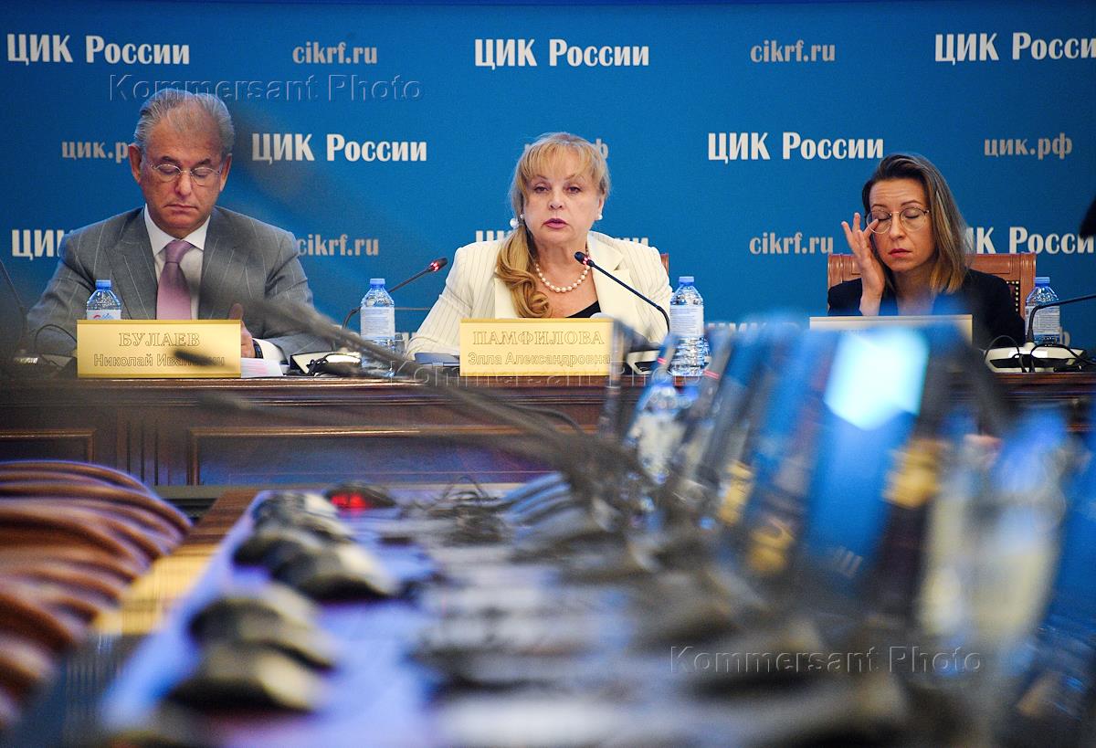 Заседание комиссии Центральной избирательной комиссии (ЦИК) России. Рассмотрение пакета о дистанционном электронном голосовании в Единый день голосования - 2022. Слева направо: заместитель председателя ЦИК России Николай Булаев, председатель ЦИК России Элла Памфилова и секретарь ЦИК России Наталья Бударина во время заседания.