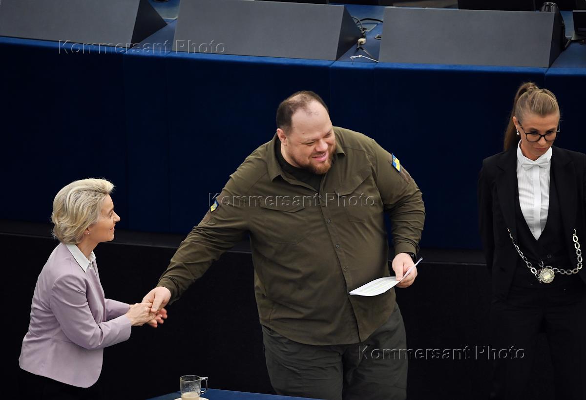 Plenary session of the European Parliament in Strasbourg. President of the European Commission Ursula von der Leyen (left) and Speaker of the Verkhovna Rada of Ukraine Ruslan Stefanchuk (center) during the meeting.