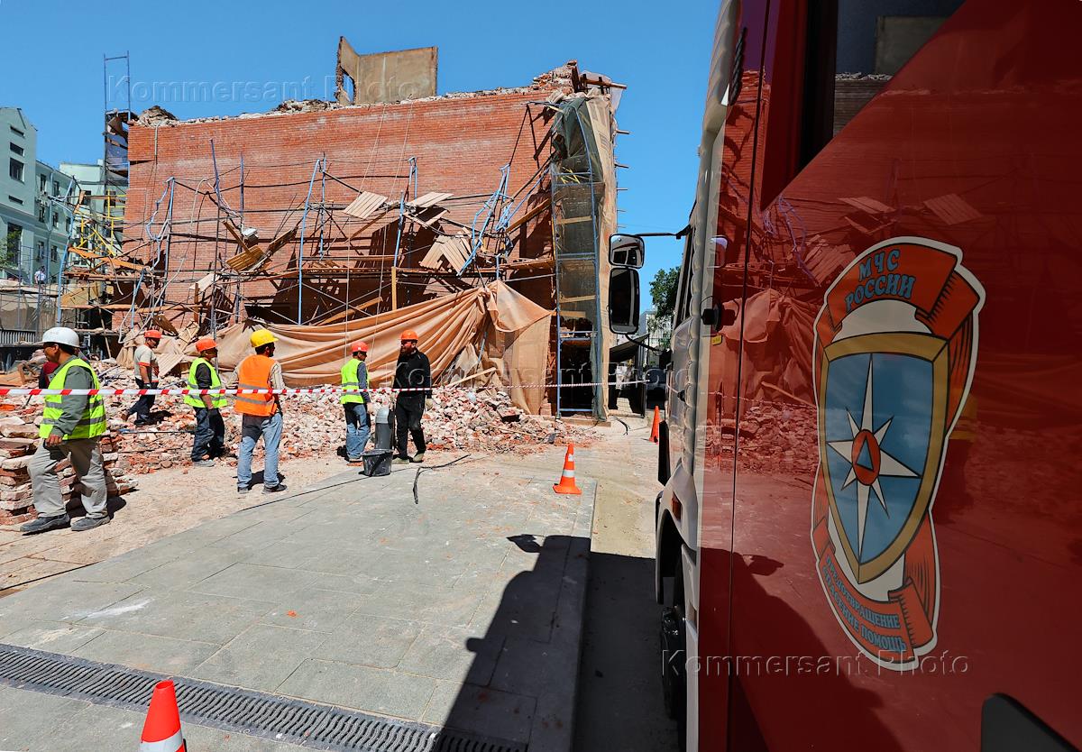 The consequences of the collapse of scaffolding in Leontievsky Lane near the 19th century mansion, which is under reconstruction.