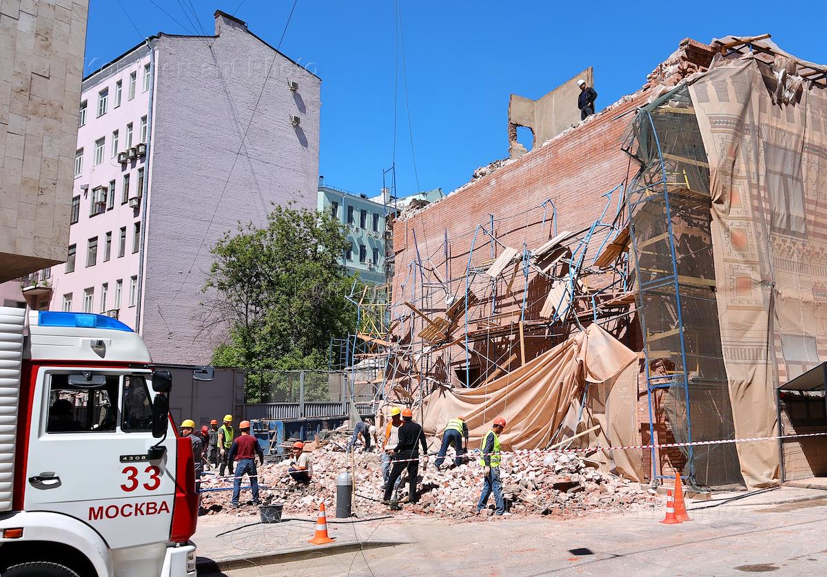 The consequences of the collapse of scaffolding in Leontievsky Lane near the 19th century mansion, which is under reconstruction.