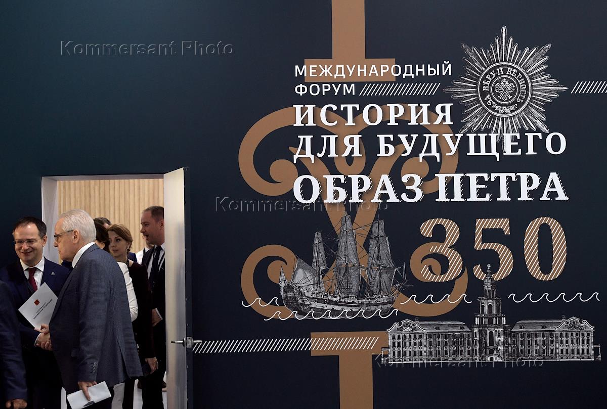 Forum "History for the Future. The Image of Peter" at VDNH in the pavilion "Russia - My History". Russian presidential aide Vladimir Medinsky (left) at the forum.